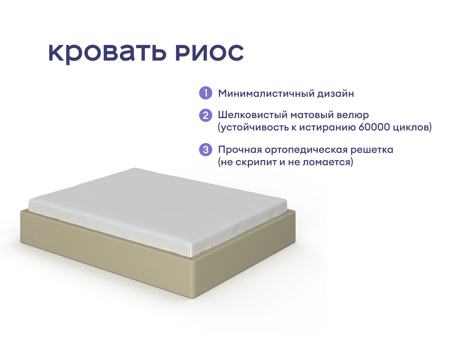 Оформлена в изящном минималистичном стиле. В модели отсутствуют изголовье, что позволяет универсально вписать мебель в большинство современных интерьеров. Простые и лаконичные линии кроватного бокса оставляют акцент на главном – удобной зоне отдыха и красивых пропорциях. Коробочный каркас кровати собран из ДСП. В качестве обивки модели выступает велюр. В комплект входит ортопедическое металлическое разборное основание.