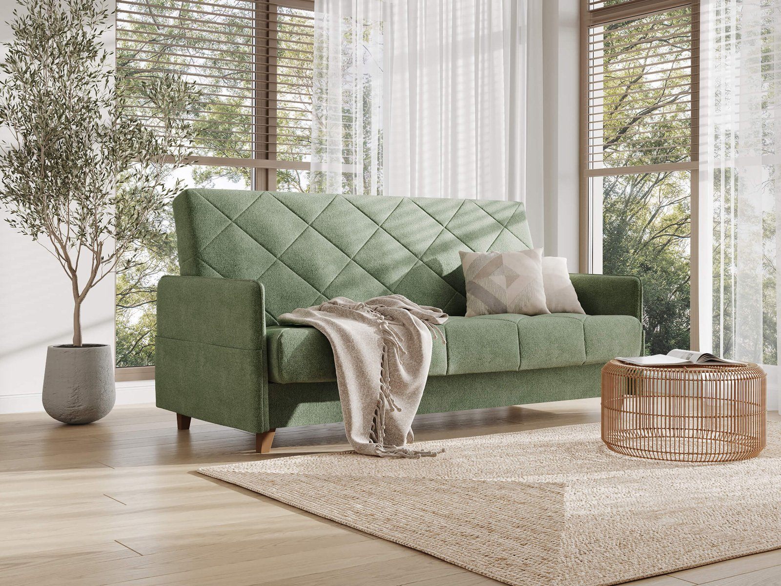 Диван для сна в скандинавском стиле с механизмом трансформации «клик-кляк» и коробом для хранения. Основание дивана металлическое, с ламелями. Матрас анатомический с независимым пружинным блоком. Благодаря съемному чехлу с объемной стежкой в форме ромбов, диван органично впишется в современные интерьеры в скандинавском стиле и стиле минимализм.