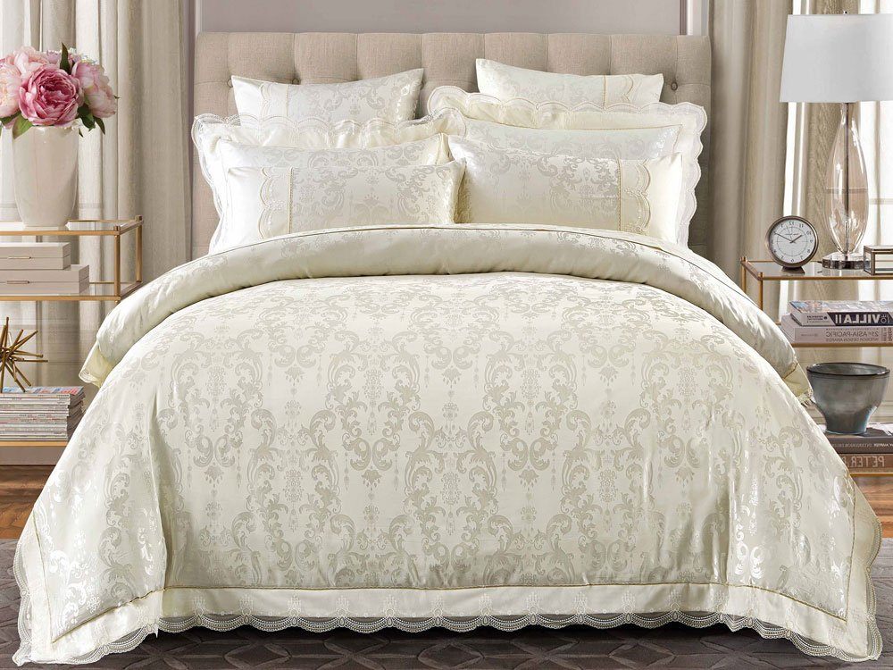 Богатый жаккардовый рисунок в итальянском стиле, нежнейший ванильный оттенок и роскошное двухцветное кружево придают этому великолепному комплекту ноту романтики и очарования. Верх пододеяльника и наволочек - жаккардовый люкс-сатин (55% вискоза, 45% хлопок). Оборотная сторона пододеяльника, наволочек и простыня - люкс-сатин (100% хлопок).