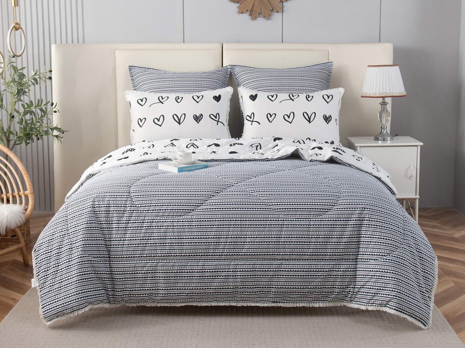 В комплекты комфортеров с одеялом Бернадетт входят наволочки, простыня и легкое всесезонное одеяло. Оцените это современное и очень удобное решение, которое идеально подходит тем, кто не любит возиться с пододеяльниками.
