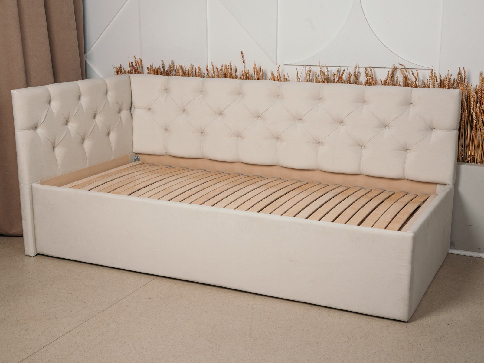 Кровать Бриони обладает элегантным лаконичным дизайном и изящно впишется в детскую комнату, спальню или гостиную. Модель можно использовать в том числе как диван, поскольку она оснащена уютным угловым изголовьем. Спинка мебели получила мягкую стёжку, оформленную каретной стяжкой. Пуговицы обтянуты той же тканью, что и основное изделие. Угловая структура кровати позволяет существенно сэкономить пространство и обеспечить при этом комфортный отдых.