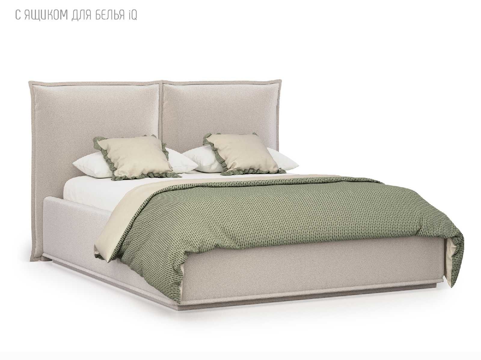 Кровать укомплектована IQ с подъемным механизмом и ящиком для белья без дна (дополнительная платная опция - дно к ящику IQ из HDF (ХДФ). Каркас кровати на цоколе, декоративный чехол на цоколе съёмный. Глубина ящика для белья - 30 см, без ограничения нагрузки на ящик.