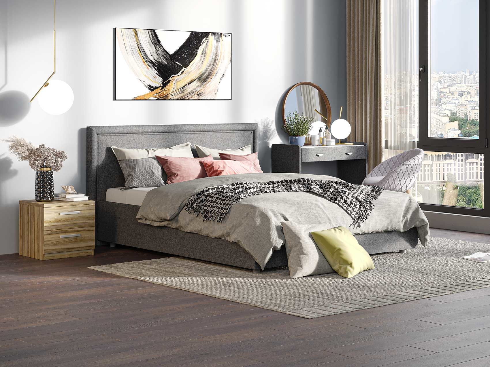 Элегантная интерьерная кровать с мягким изголовьем. Модель изготовлена из ДСП. Обратная сторона изголовья обита спандбондом, но её можно выполнить из основного обивочного материала. При необходимости кровать может быть укомплектована подъемным механизмом с бельевым ящиком или трансформируемым основанием Aquarius (размером 160-200).