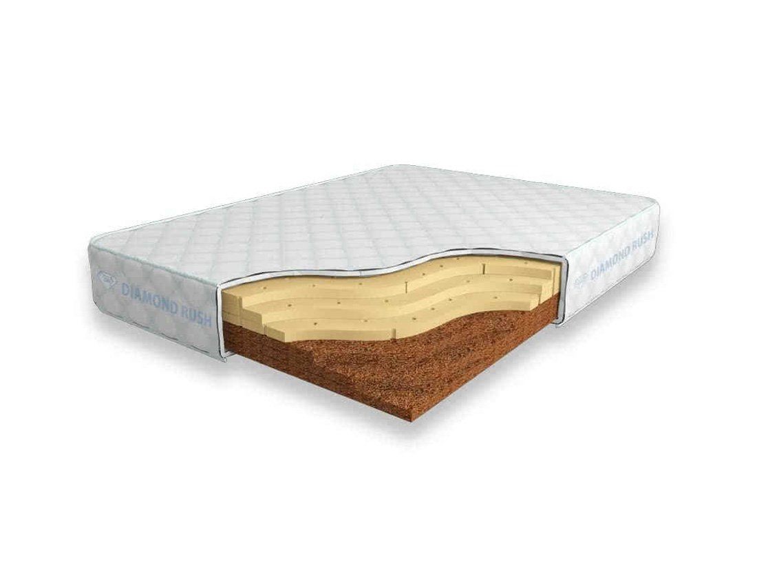 Матрас Diamond Rush Cocos Contrast 18 DR является беспружинным, т.е. не имеет в своей основе пружинного блока. Особенность этой модели в том, что она сочетает в себе сразу мягкий и жесткий матрасы. С одной стороны идут слои латексированной кокосовой койры (3см), с другой - натурального латекса с перфорацией (3см).