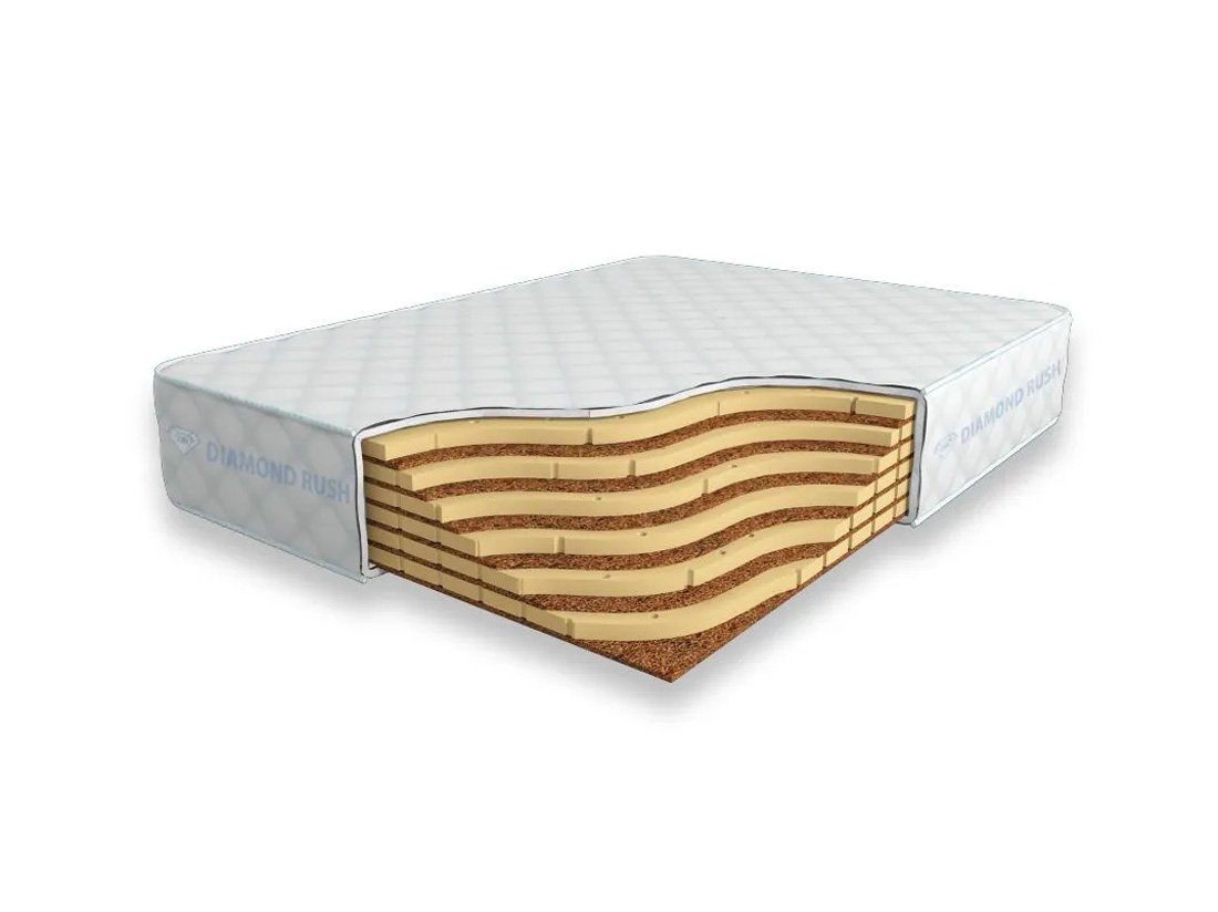 Матрас Diamond Rush Mix Cocos 24 DR является беспружинным, т.е. не имеет в своей основе пружинного блока. В его состав входят чередования слоев латексированной кокосовой койры (1см) и натурального латекса с перфорацией (3см). Эта модель имеет разные по жесткости стороны.