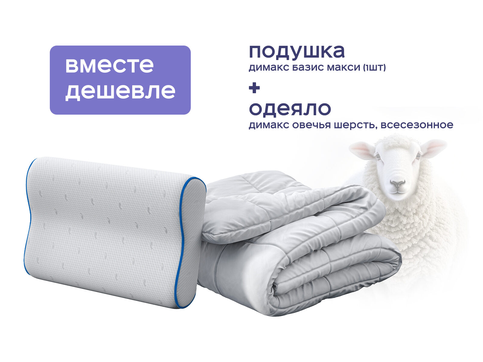 Комплект одеяло Димакс Овечья шерсть всесезонное + подушка Димакс Базис Макси 1 шт. Мечтаете о комфортном сне, который объединен «умным» теплом и точностью анатомической поддержки? Одеяло из овечьей шерсти дарит дышащее тепло, а подушка Базис Макси с волнообразной формой подстраивается под каждую линию вашего тела. Это не просто набор для сна — это система, которая заботится о вашем здоровье, даже когда вы отдыхаете. И всё это с экономией до 43%, если приобретать товары комплектом.