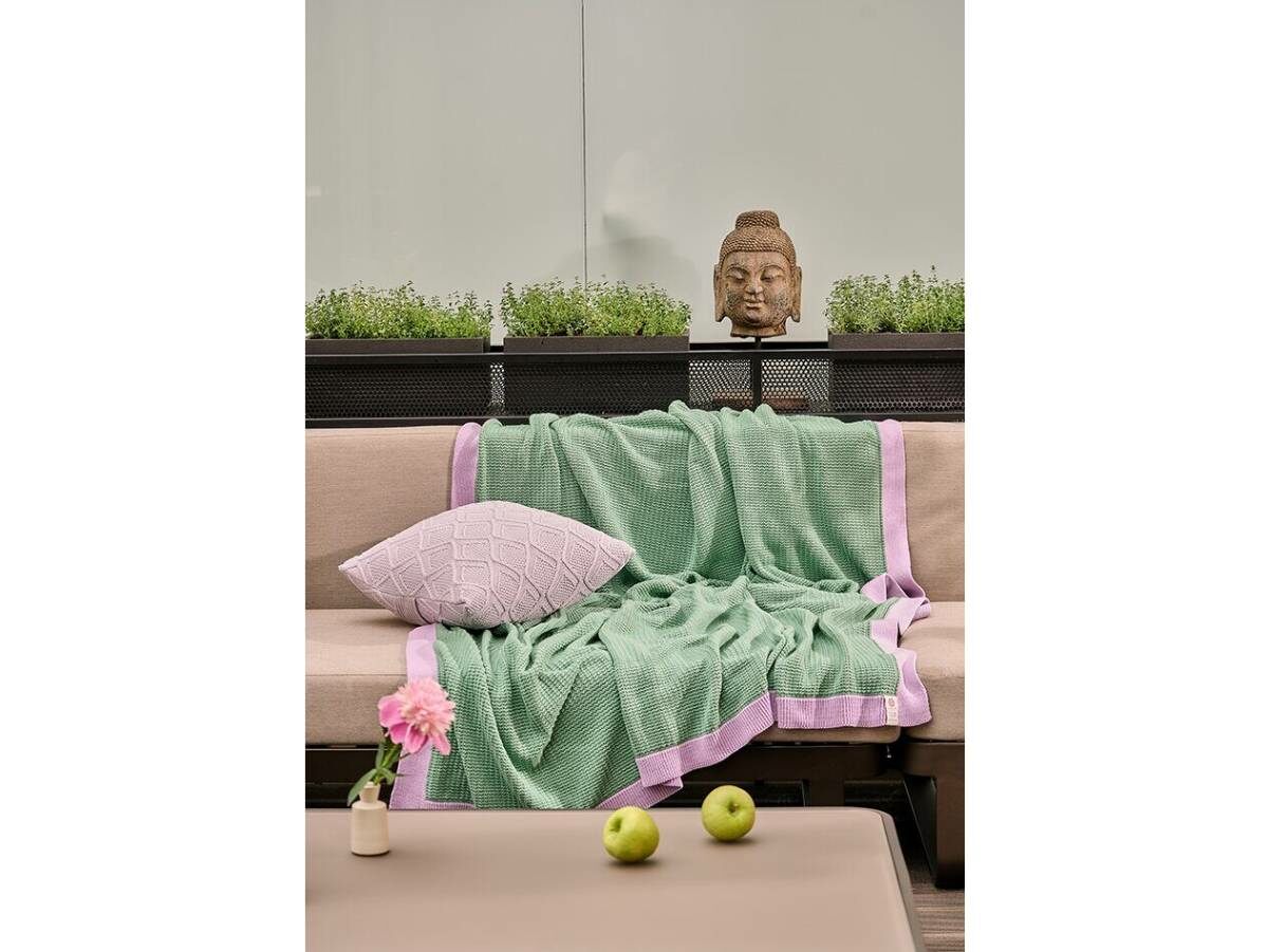 Ухаживайте за пледом как за своим любимым хлопковым вязаным свитером : стирка в ручном режиме жидким моющим средством для нежных вещей, сушить в разложенном виде на горизонтальной поверхности.