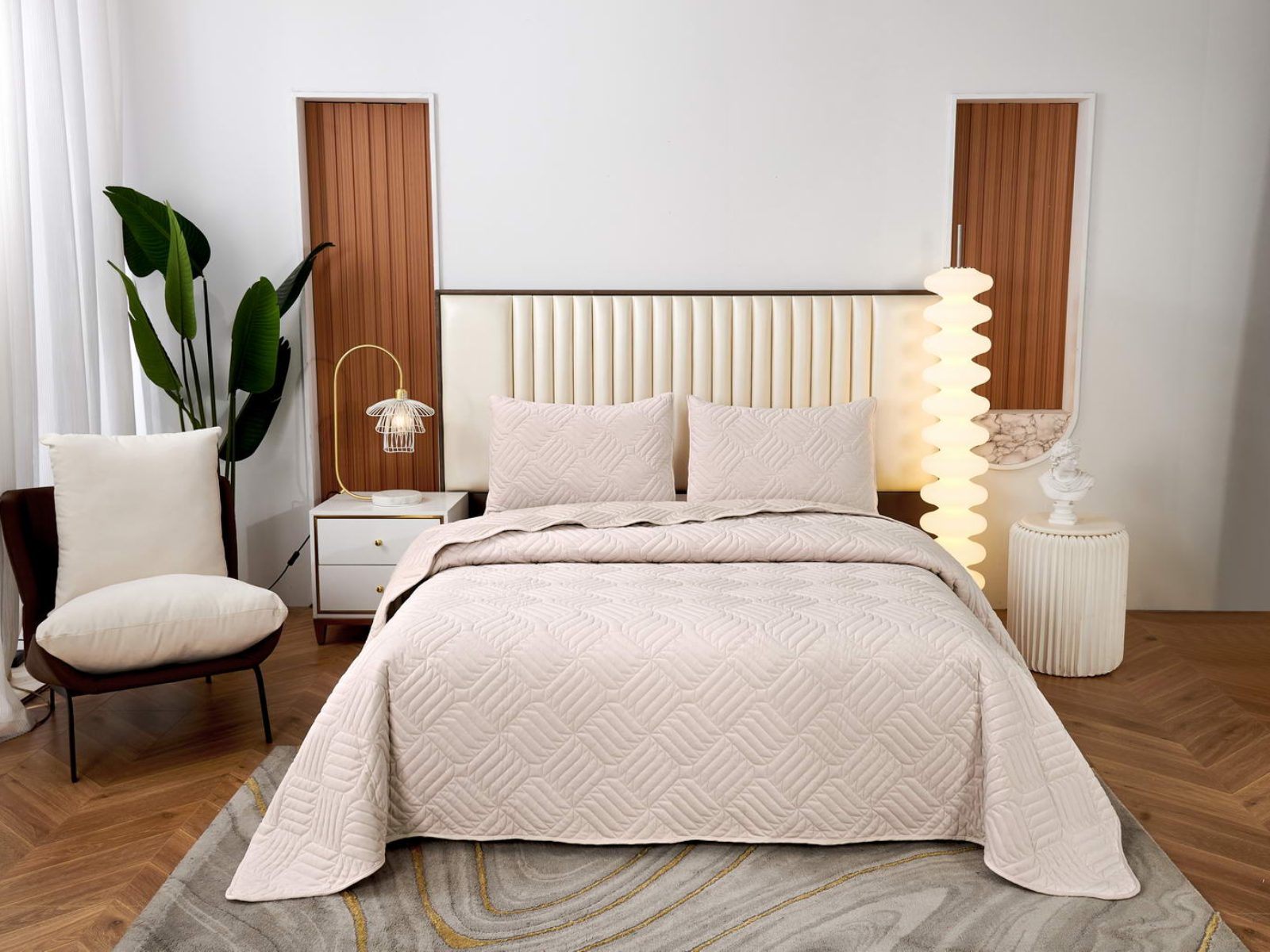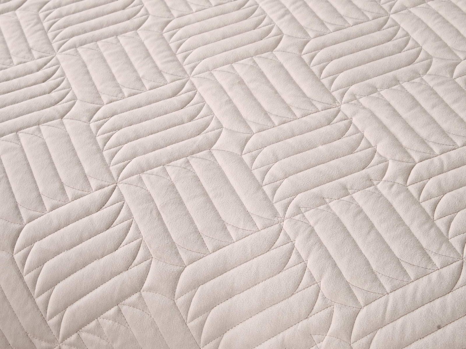 Покрывала выполнены в 10 оттенках: крем, мокко, пепельный, песочный, светло-бежевый, светло-серый, серый, темно-серый, чайная роза и черный. Стежка в виде геометрического орнамента подойдет к любому современному интерьеру. Из-за особого плетения, велюровая ткань покрывала отражает свет и красиво переливается при различном освещении.
