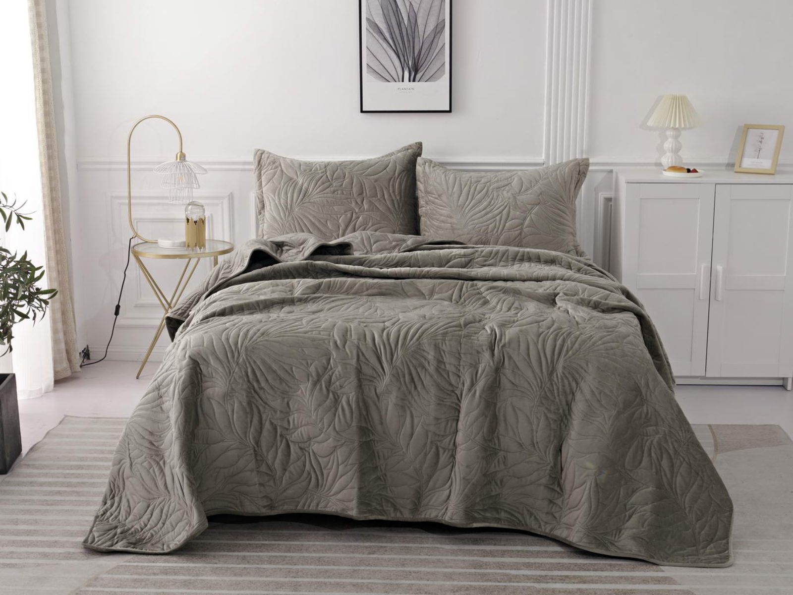 Стёганое покрывало Глория изготовлено из 100% вискозы, что делает его невероятно мягким и комфортным. Рисунок напоминает листья лавра. Такой орнамент подойдет большинству современных интерьеров.